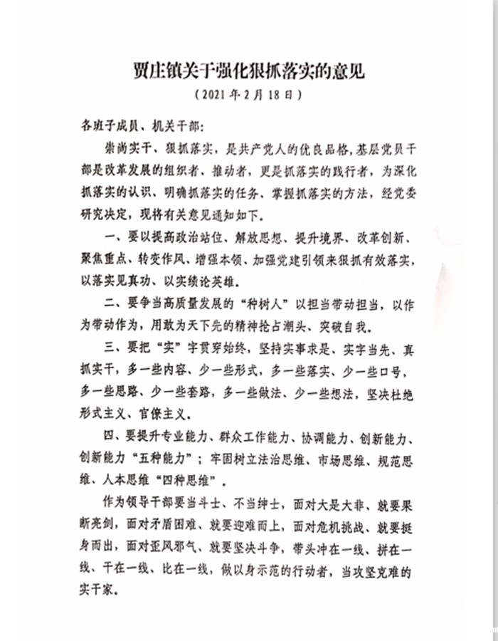 信心在,勇气就在;实干在,成功就在。在县委、县府的坚强领导下,贾庄镇上下将担负使命拼命干、精准发力加油干、紧盯项目埋头干、勇于担当带头干、聚精会神合力干,奋力开创贾庄经济社会高质量发展的新局面。